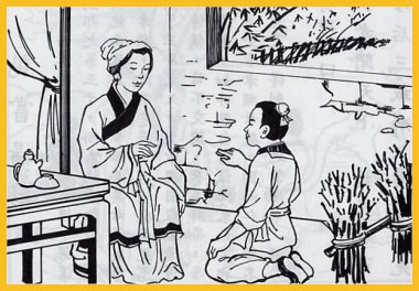 周朝曾参,名子舆,奉养母亲,极为孝顺,有一次往山中砍柴时,家里忽然有客来到,母亲不知所措,盼望曾参速返,乃咬破手指,在山中之曾参,陡觉心痛,卜有预兆,急忙挑柴赶回家中,硊在母亲膝前,问其缘故,母亲说: 因有客至,乃咬手指使你醒悟。 曾参事母至孝,母亲手指竟与其性灵相通。 |