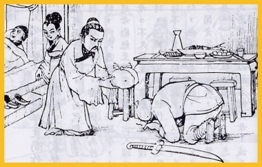 后汉赵咨,字文楚,东郡燕人,幼年失父,事母至孝,晨昏定省,供奉甘旨不缺,邻里莫不称赞。 赵咨出身贫穷,苦学有成,官至敦煌太守,后因病辞官,归里率子孙耕农,以维生计。 一夜深更,盗贼前来抢刧,赵咨深恐母惊惧,乃先至门口迎贼入室,设宴殷款侍,席间向羣贼称: [老母年届八十,身弱多病,须静养,请勿喧嚷,以免惊动老母。 ] 盗贼甚受感动,跪地叩头叹曰: [敢犯孝子,定无善报。 ] 言毕夺门奔出,赵咨持物欲赠,追之巳不及,事传四方,赵咨名气益盛。