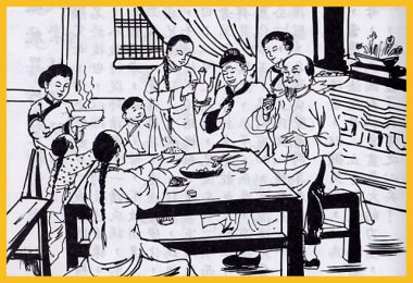 清朝,长江口外之崇明岛上,有吴氏四兄弟,因家贫困,幼年时,皆被双亲卖与富户为僮仆,及长大,各自节俭勤奋,自力赎返乡,毗连建宅娶妻。 四兄弟不忘亲恩,争相供养父母,议家每家轮流供养一月,惟妯娌皆不赞同,认为如此,须经三月之久始能轮及,乃改议一日换一家, 后复以按日轮流,亦须三日之久,终以决定一家奉养一餐,长房供奉早餐,二房午餐,三房晚餐,四房早餐,依次轮流,并定五日一次,共烹佳肴款侍,子孙儿媳争相端菜敬酒,合家欢乐异常。 其双亲享福近百岁始终。